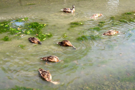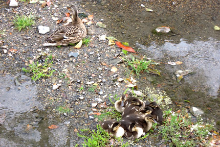 カルガモの親子 投稿日時: 2012年5月24日 投稿者: sabawo 先月の弘法さんで見かけたカルガモの親子です。 二組の親子がいたのですが、庭園にいた親子ではヒナが一羽、段差を超えられなくて兄弟姉妹とはぐれて鳴いている姿をみていたので、今月はどうかと気になっていました。 1羽2羽3羽4羽 カモのヒナ〜♪ 『ヒナのうた」が頭の中を・・・。 今月の弘法さんでは、 お〜、すくすく育っていました。 もう、見守るお母さんと同じ大きさですね。 よかった。(●^o^●) あ、数えないでくださいね。