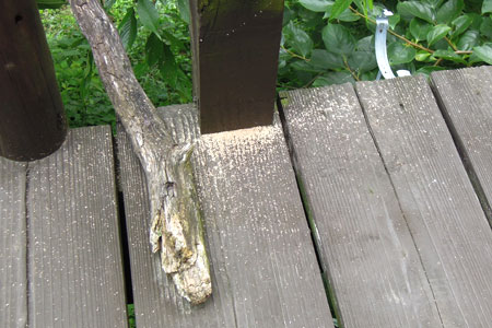 階段横のベンチ、クマバチさんのおうちとなっております。